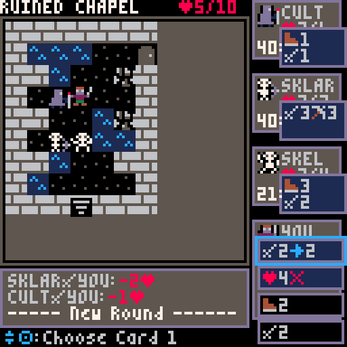 PICOhaven 2 is a tiny, lo-fi, card-based tactical RPG inspired by my love of the board game Gloomhaven* (and less directly, of other 2D tactical turn-based games such as the GBA Fire Emblem and Into The Breach). It's built on the delightful PICO-8 fantasy console, which provides tight creative and scope constraints, such as a 128x128 pixel screen resolution, 16 preset colors, and only 32kB for code, graphics, and sound combined.